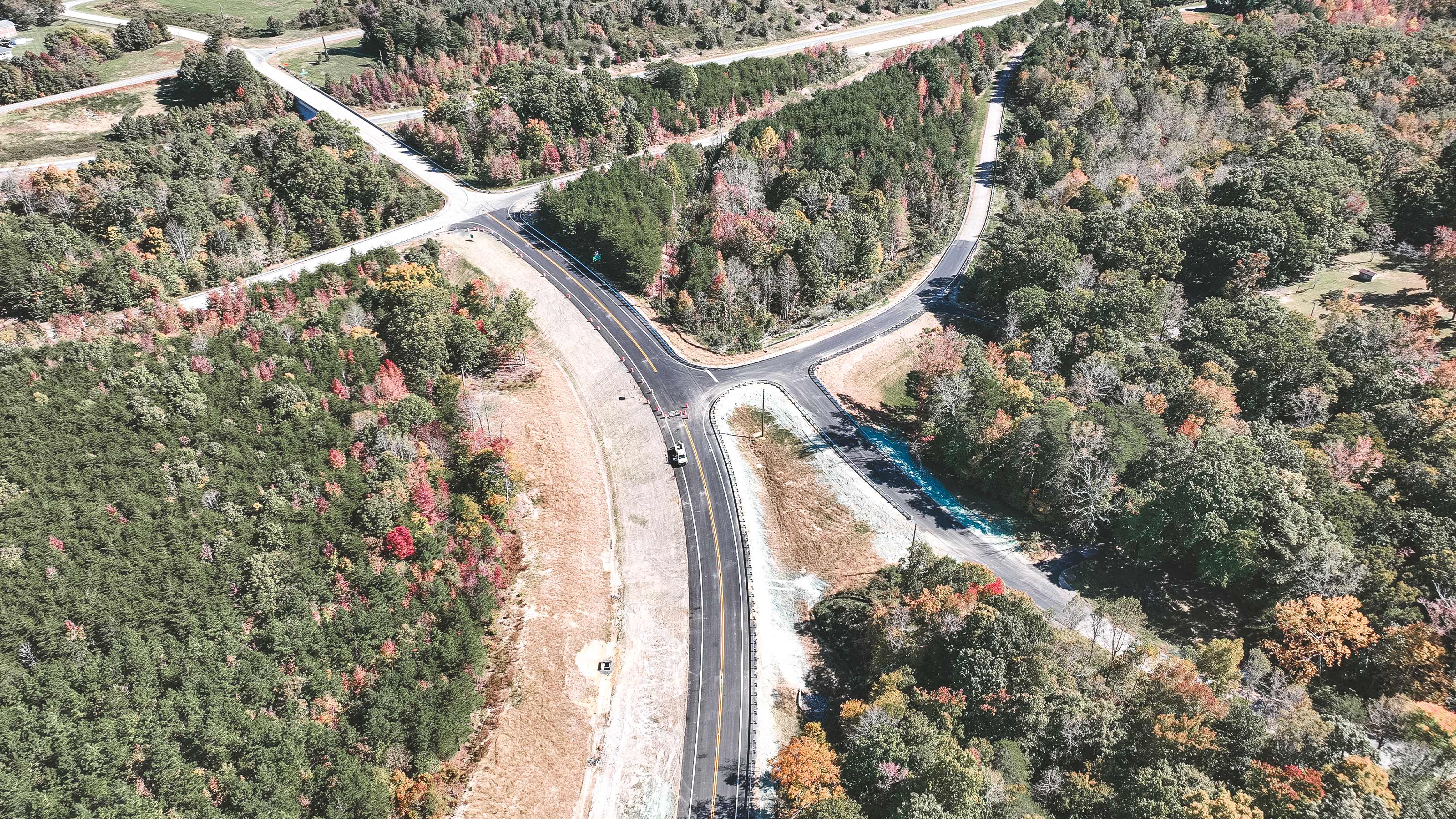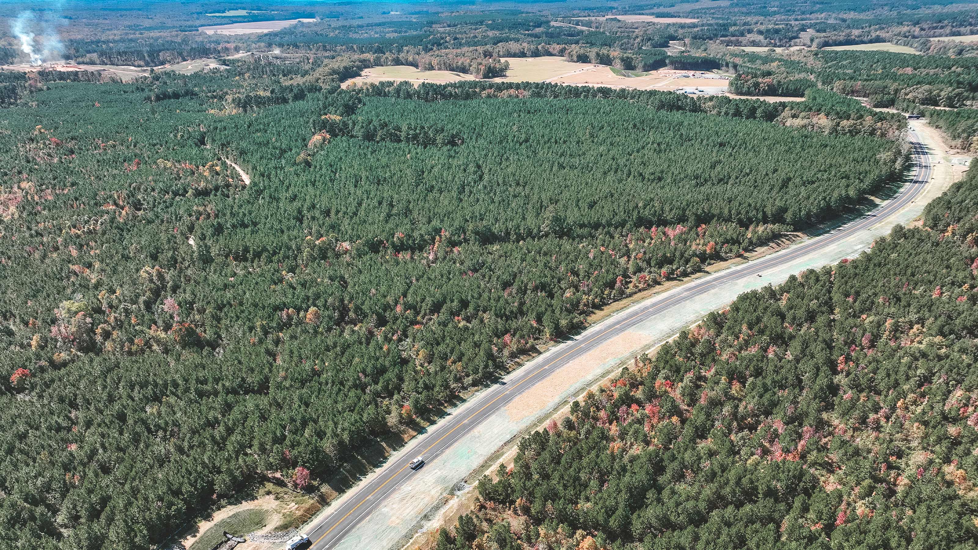 The civil design changes for the new connector road was built as a new two-lane roadway, but graded to accommodate for a future four-lane expansion, which allowed for immediate mobility with long-term expansion capacity built in. Crews cleared 44 acres, installed multiple box culverts and storm drainage systems, built bioretention facilities, executed mass excavation with rock blasting, and completed the corridor with subgrade stone, asphalt paving, and final signage.
